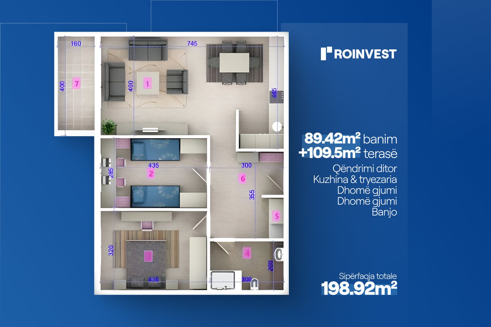Jepet me qira banesë në kompleksin Zenit Invest, Gjilan, me sipërfaqe prej 89.42 m² hapësirë banimi dhe me 109.5 m² terrase.